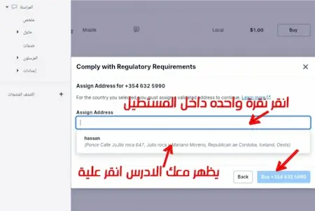 الآن يمكنك النقر على شراء رقم واختيار رمز الدوله ومن ثم شراء وستظهر لك صفحة مثل اللى في الصوره انقر على المستطيل سوف يظهر لك اسفل المستطيل الادرس اللي اضفته انقر عليه ، بعد ذلك سوف يفتح الرقم لشراء انقر عليه وبذلك قد قمت بشراء الرقم بكل سهولة.